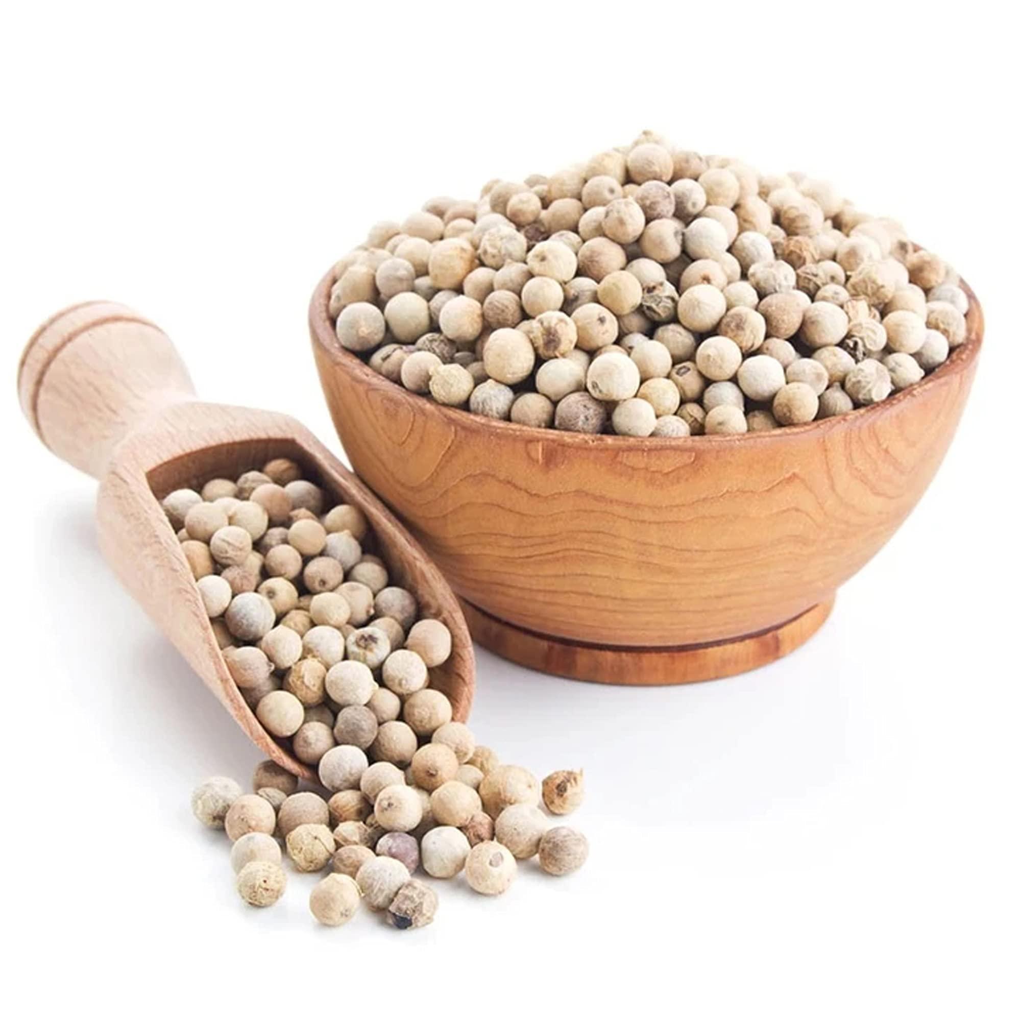 WHITE PEPPERCORN: White pepper is a spice produced from the dried fruit of the pepper plant, Piper nigrum, as is black pepper. White pepper is often used in dishes that need a peppery bite but where you don't want black flecks, such as in white sauces and potato dishes.