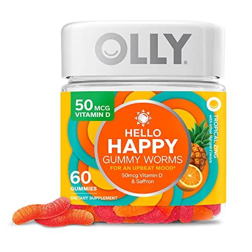 Sunny side up. OLLY Hello Happy Gummy Worms for adults deliver a delightful dose of cheer to help you feel upbeat. The star of the show? Highly-prized Saffron, a superspice thats coveted for its powerful mood-balancing properties.* All this goodness is packed in a delicious Tropical Zing flavor (a lively blend of pineapple, peach and orange) to make these adult gummy worm supplements even more irresistible. Zero artificial colors or flavors, and gluten-free, too. Good health is at the center of everything we do. That's why weve made it our mission to make nutrition easy to understand. We do it by crafting products that are as effective as they are deliciousbecause we know when something feels good, youre more likely to do it. *These statements have not been evaluated by the Food and Drug Administration. This product is not intended to diagnose, treat, cure or prevent any disease.
