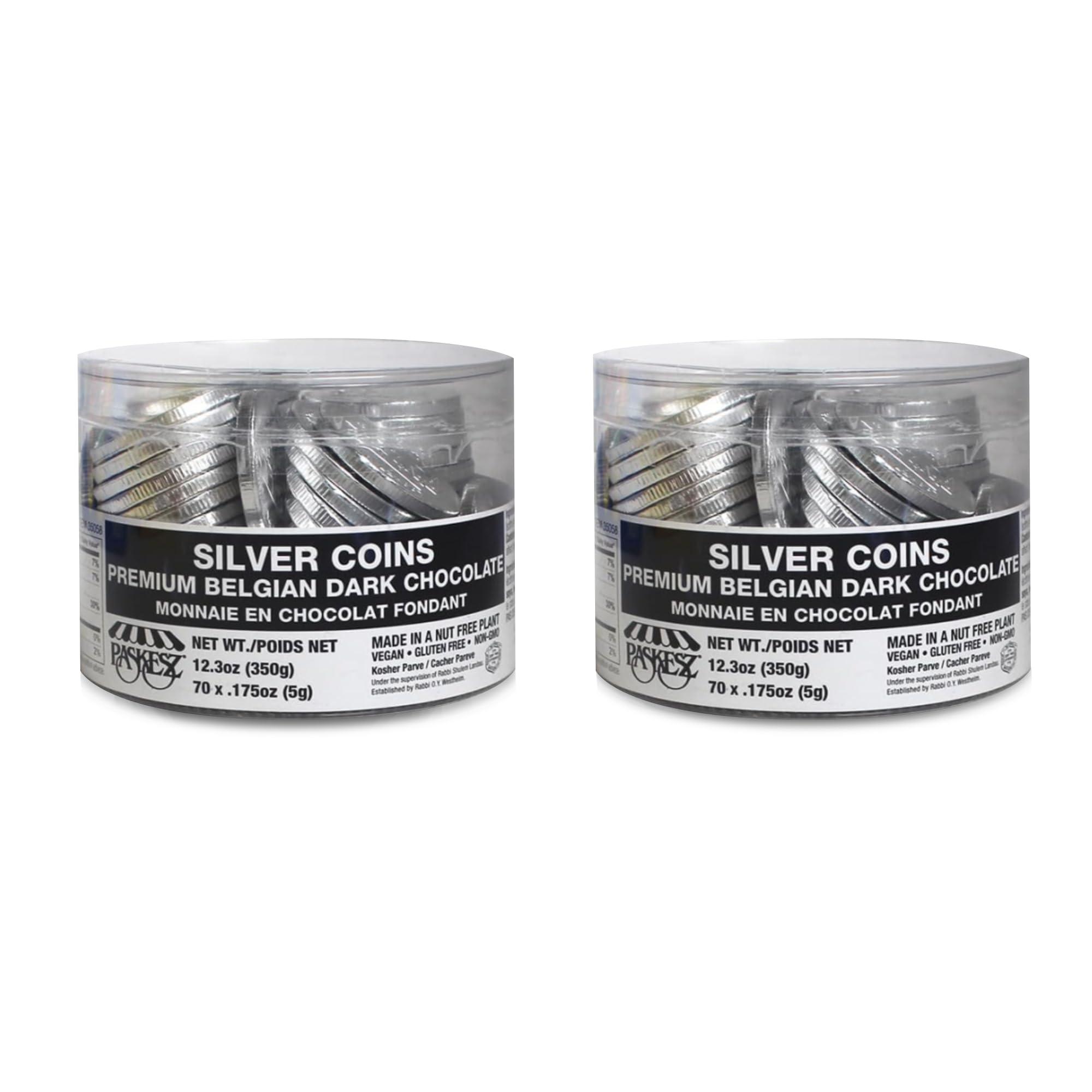 Only Kosher Candy Only Kosher Candy Nut Free Silver Foil Wrap Hanukkah Chocolate Gelt Coin, Kosher Parve Chanukah Gelt Chocolate Coins, Premium Belgian Dark Chocolate Silver Coin Tub for Holiday Gifts - 2 Tub Pack