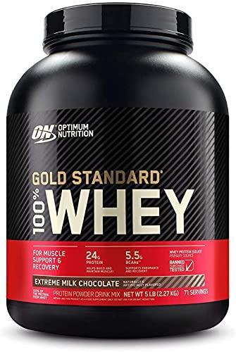 Optimum Nutrition Gold Standard 100% Whey Protein, 80 Servings; No Artificial Growth Hormones Protein Blend of Whey Isolate and Concentrate 24 Grams of Protein Gluten Free Extreme Milk Chocolate 5.46 LB Per bag