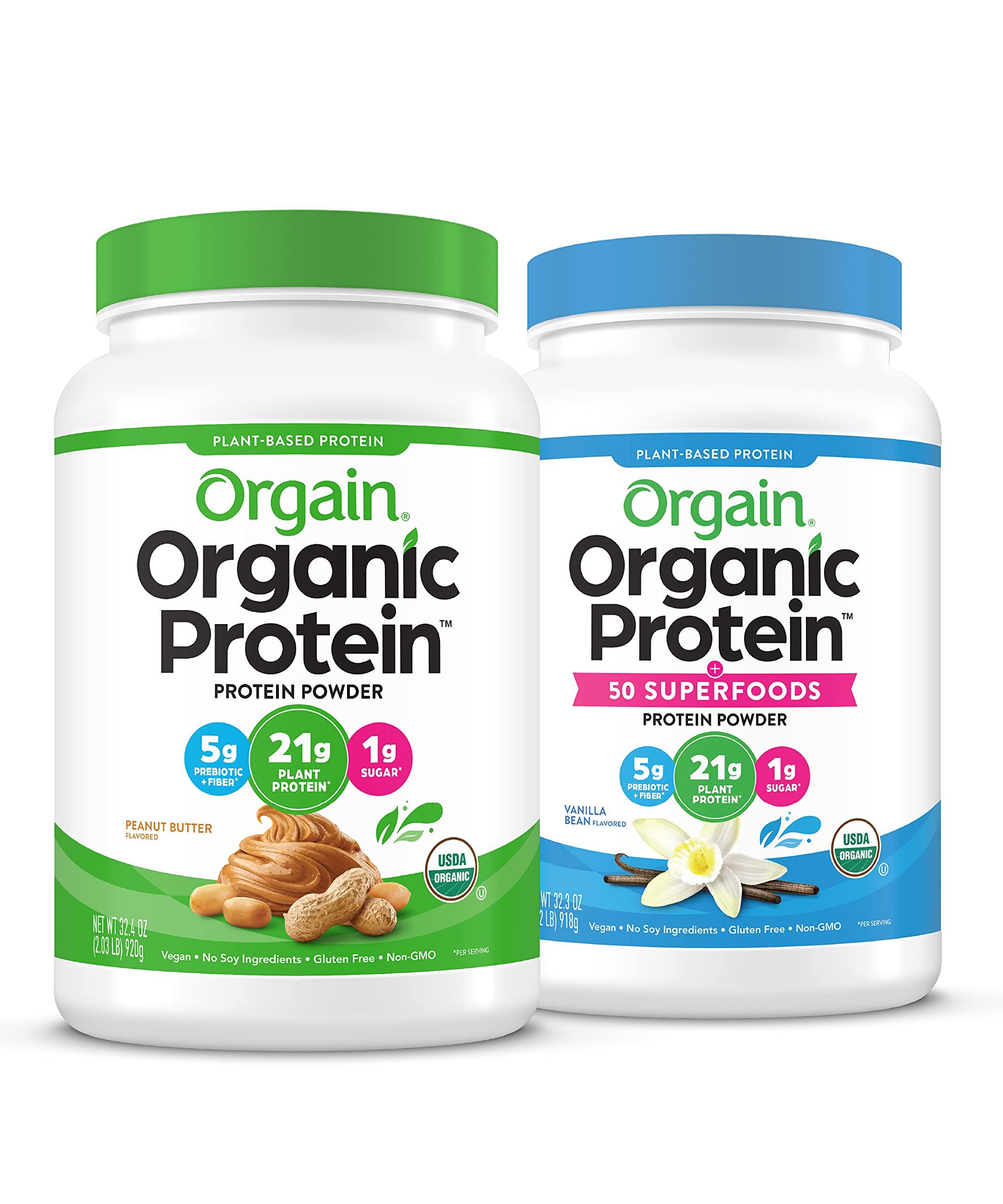 - Includes 1 (2.03 Lb) Orgain Organic Plant Based Peanut Butter Protein Powder and 1 (2.02 Lb) Orgain Organic Protein and Superfoods Vanilla Bean Powder.