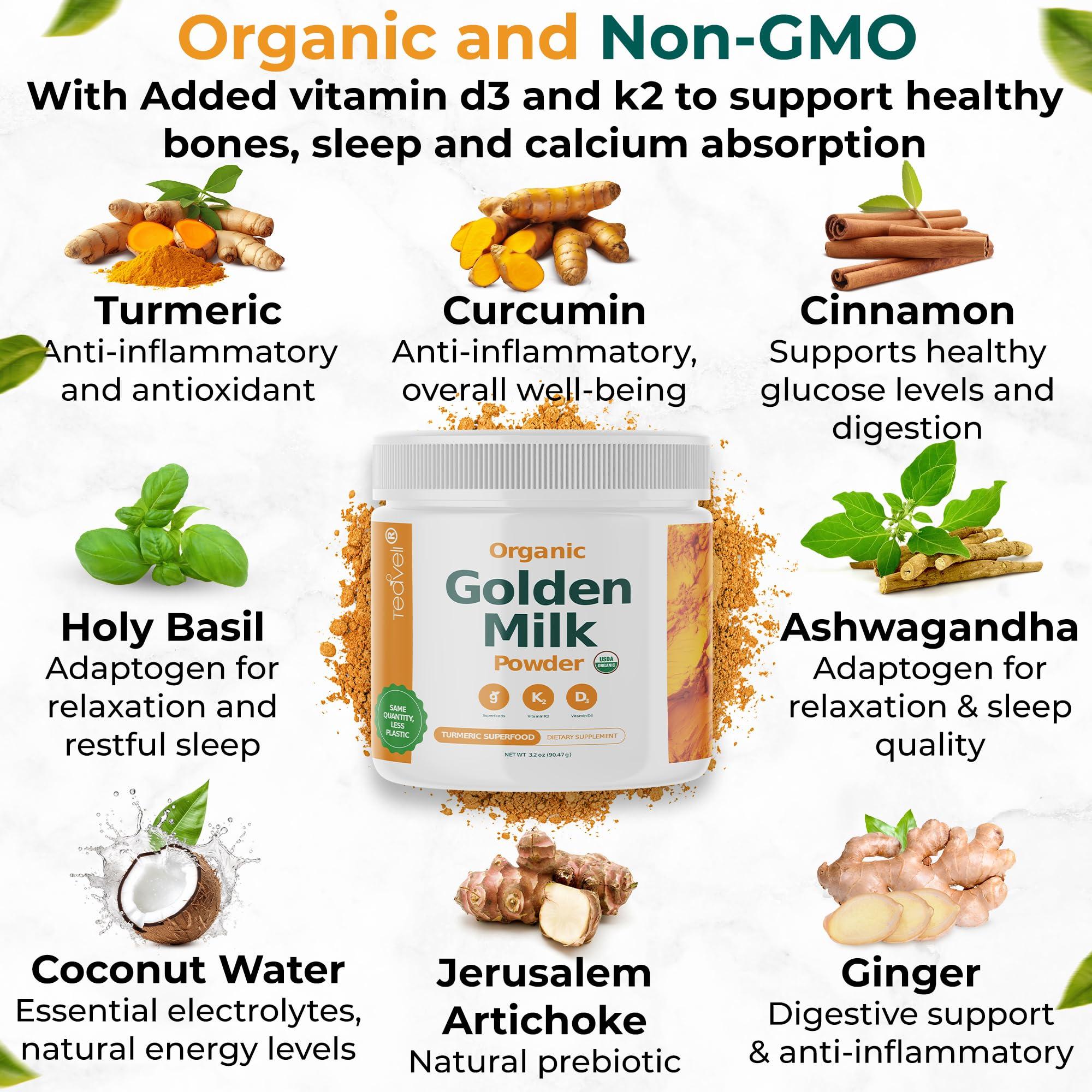 - NINE SUPERFOODS WITH VITAMIN D3 & K2 IN EACH SERVING: One convenient way to get all the benefits of nine superfoods in one serving. This unique blend includes Vitamin D3, Vitamin K2, Turmeric curcumin, Turmeric root powder, holy basil, artichoke, coconut water, Bioperine, ginger root, KSM66 Ashwagandha, and cinnamon bark. So why not give our organic golden milk a try today? You'll be glad you did!