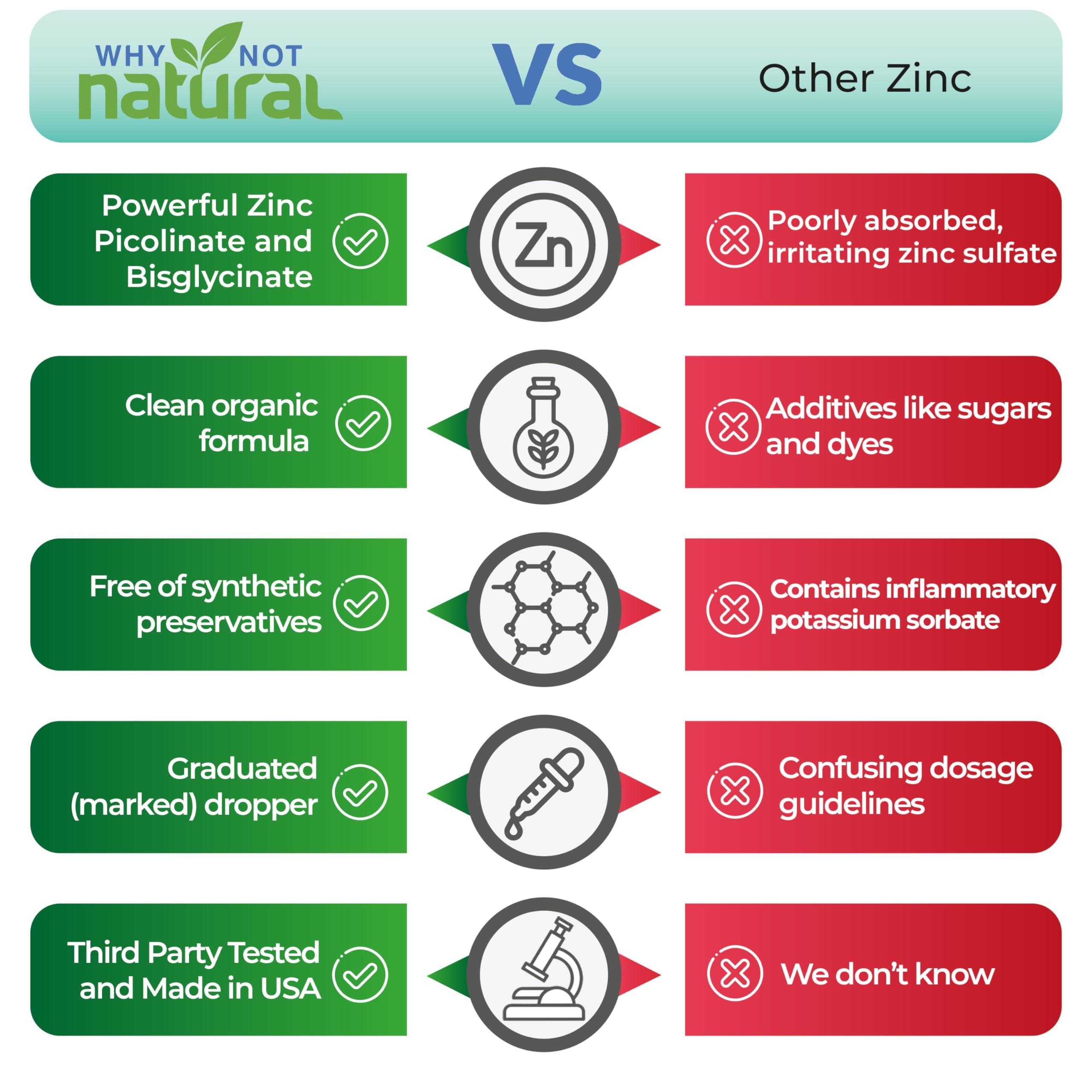 - BEST FORMS (AND DOSAGE) OF ZINC: Say no to poorly-absorbed, cheap zinc sulfate found in most zinc supplements! We use zinc picolinate + zinc bisglycinate chelate (both well-studied in clinical trials) which are better absorbed and provide optimal health benefits. 338 mg premium zinc per bottle! Goldilocks dosage is important - too much zinc can cause as many issues as too little, and ours is perfectly dosed and allows for flexibility by being in liquid form.