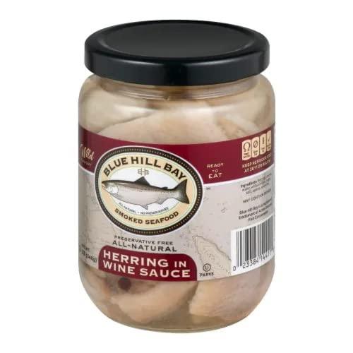 Blue Hill Bay Herring is an MSC certified, sustainably caught small fish that packs a big pickled herring punch! Not only Blue Hill Bay Herring in Wine Sauce great for you, but people have also enjoyed pickled herring for thousands of years. This herring is simply brined and prepared with onions, and Blue Hill Bay Herring in Wine is the most traditional and simple herring INGREDIENTS: Herring, onions, water, white vinegar, sugar, salt, spices and wine. CONTAINS: Fish (May contain bones) OTHER NUTRITIONAL FACTS: 800 mg Omega-3 Fatty Acids per serving, Good source of Protein (5 g) per serving, and Gluten Free