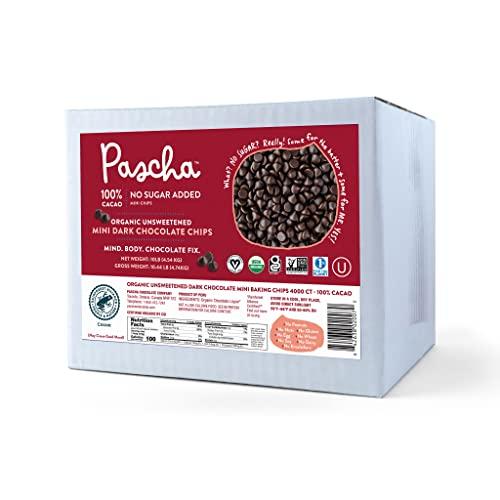 - Welcome to the delicious healthy chocolatey world of Pascha. This is a 10 lb bulk pack (1 bag in box) of 100% cacao unsweetened organic dark chocolate mini chips. It is surprisingly smooth and well textured and not as bitter as you would expect from an 85%. It works well in all baking applications. There is a powerful chocolate flavor and depth but it still blends well in any recipe that calls for chocolate chips.