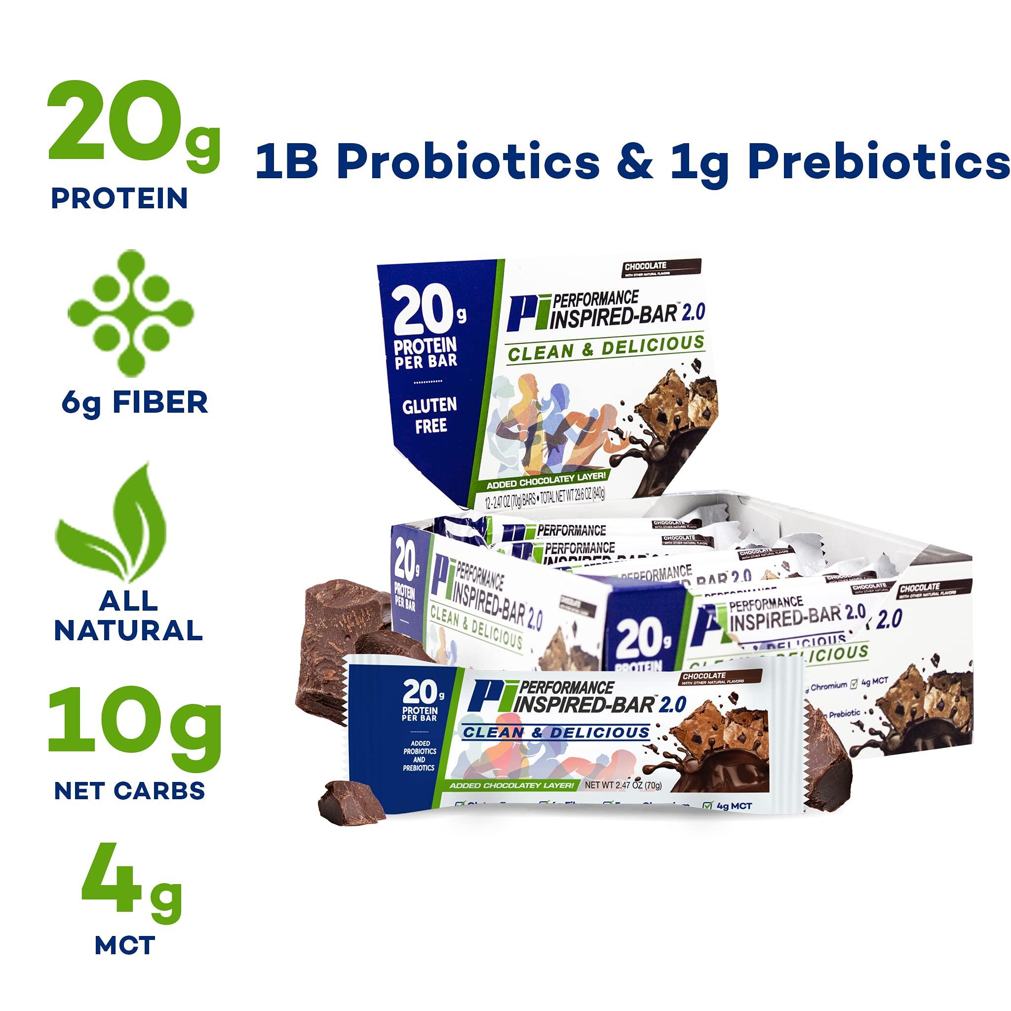 Performance Inspired Nutrition Protein Bar 2.0 is a high-protein, great-tasting bar designed to fuel muscle recovery, energy, and overall wellness. With a full 20g of protein, 6g of fiber, and 4g of MCT oil, this gluten-free bar provides sustained energy and digestive support while keeping you feeling full and satisfied. Enhanced with 1 billion CFU of Bacillus coagulans probiotics and 1g of prebiotics, this bar promotes gut health and digestion, making it an excellent pre- or post-workout snack, meal replacement, or on-the-go fuel. Additionally, 5mcg of chromium is included to help support blood sugar balance. Designed for athletes, fitness enthusiasts, and everyday individuals, this bar is formulated with clean, high-quality ingredients and is free from artificial flavors, sweeteners, and colors. Co-founded by Mark Wahlberg and trusted by professional athletes like Draymond Green, Performance Inspired Nutrition is committed to science-backed, effective, and naturally formulated supplements. Each box contains 12 protein bars, manufactured in GMP-certified facilities for guaranteed purity and potency. Upgrade your nutrition with Performance Inspired Protein Bar 2.0a delicious and functional snack for active lifestyles!