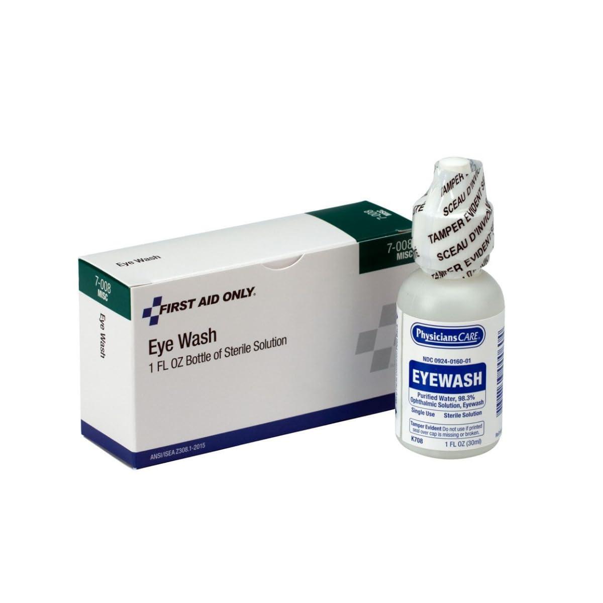 PhysiciansCare by First Aid Only Eyewash flushing solution in a 1-ounce bottle is a sterile isotonic buffered solution perfect for flushing or irrigating eyes. Packaged for both standalone use and as a refill for a first aid kit.