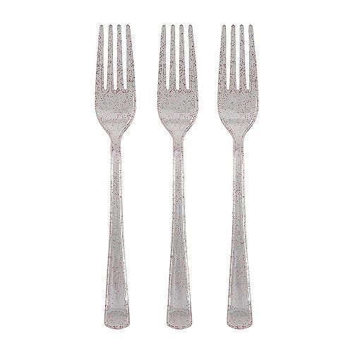 - A glam alternative to clear plastic cutlery, these plastic forks shimmer with pink glitter and are ideal for bachelorette parties and birthday parties. Material: Plastic. (4 dz./unit) Size: 7"