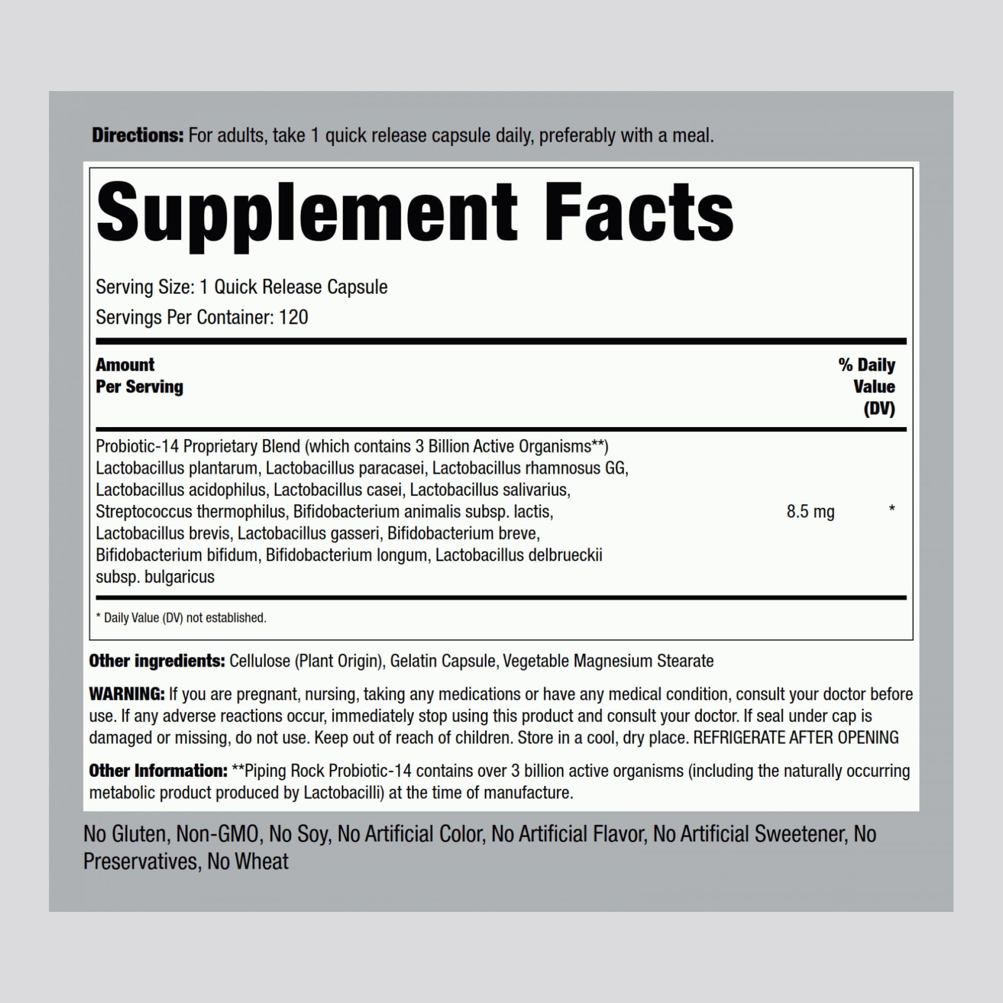 Piping Rock Probiotic Acidophilus Capsules for Women and Men | 3 Billion Live Cultures | 120 Pills | 14 Strains Supplement | Non-GMO, Gluten Free