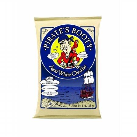 Upc: 015665-601042 pirate's booty; snack bag 24/1 oz by pirate brands foodservice (single serve); natural or organic ingredients; gluten free; wheat free ingredients: corn meal, rice, canola and/or rice oil, aged cheddar cheese (non-fat milk, salt, cheese cultures, enzymes), whey, and lowfat buttermilk. nutrition facts serving size 1 oz. servings per container 1 amount per serving calories 130 calories from fat 45 % daily value* total fat 5 g 8% saturated fat 1 g 2% trans fat n/a* g cholesterol 0 mg 0% sodium 150 mg 6% total carbohydrate 18 g 6% dietary fiber 1 g 4% sugars 0 g