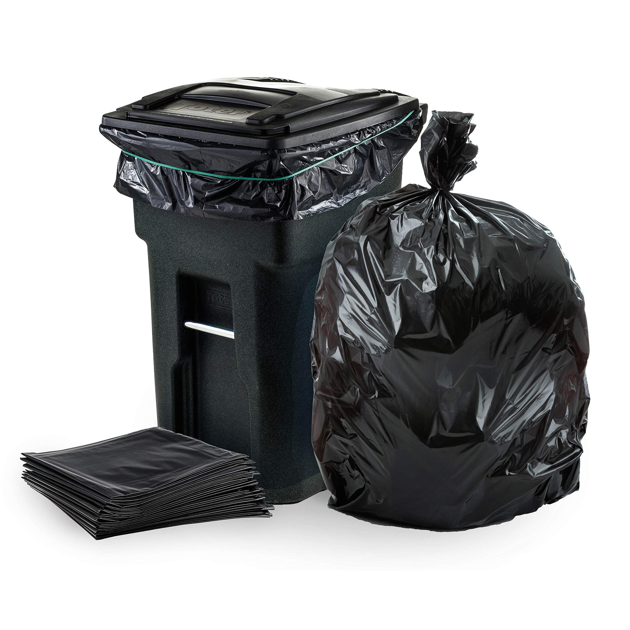 - TRASH BAGS DESIGNED FOR 64-65 GALLON TOTER CANS: These trash can liners are a perfect fit for 64-65 gallon Toter cans, but work well with other bins as well. These black garbage bags come with a 50 bag count. Dimensions: 50 x 60