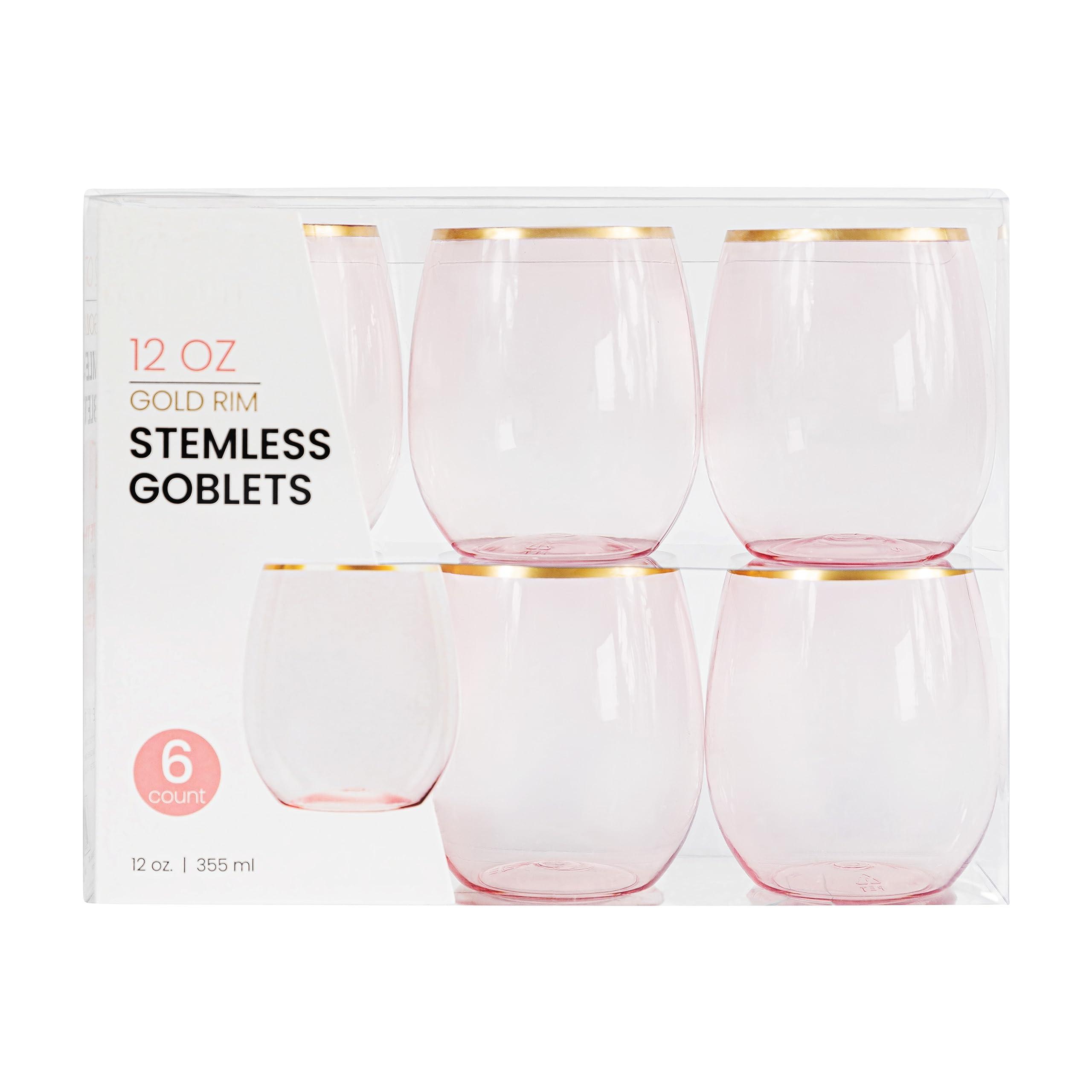Plastic Pro premium disposable stemless wine glasses, 12 Pack, 12 ounce Pink with gold rim plastic wine tumblers. High quality thick plastic glasses are 100% food safe and BPA free. No more worries about broken glass at your parties, these are shatterproof and safe for children as well. Enjoy a stress free event with no worries about hours of clean up with disposable wine glasses.