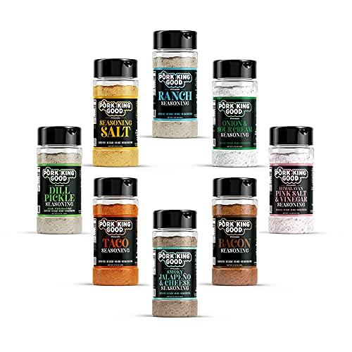 - GREAT GIFT IDEA for grill lovers or creative home cooks and chefs! This gift set includes 8 shaker jars of Pork King Good Seasoning: Dill Pickle Seasoning, Smoky Jalapeno & Cheese Seasoning, Onion & Sour Cream Seasoning, Himalayan Pink Salt & Vinegar Seasoning, Ranch Seasoning, Bacon Seasoning, Seasoning Salt, Taco Seasoning