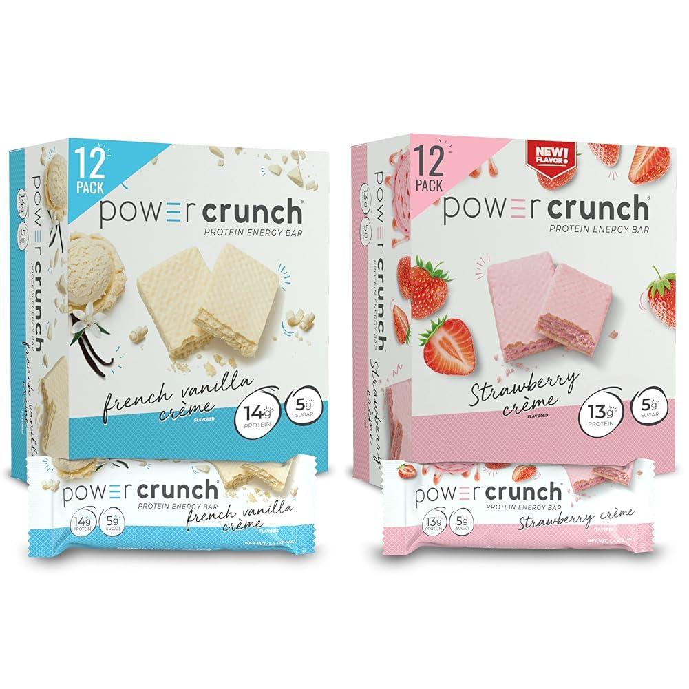 This protein bar bundle includes 24 total bars with 12 French Vanilla Creme and 12 Strawberry Creme flavored Power Crunch protein wafer bars. Both provide between 12-14 grams of protein and only 5-8 grams of sugar per 1.4 ounce bar, making them delicious high protein snacks. The French Vanilla Creme bars offer a sweet vanilla flavor paired with a crispy wafer cookie texture. Meanwhile, the Strawberry Creme bars provide a tasty strawberry flavor with a light, crispy crunch. Both satisfy cravings with protein made from easily digestible high-DH hydrolyzed Proto Whey. With their great taste and high protein content, these on-the-go snacks complement each other perfectly. The two flavors allow you to switch between sweet creme options when enjoying Power Crunch bars at home, work, school, or on the go. Each box of 12 bars also makes it easy to share these nutritious, protein-packed snacks with family or friends. Overall, this bundle combines 24 protein-rich, low sugar wafer bars in tempting French Vanilla and Strawberry Creme flavors. Their delicious taste and crunchy texture make Power Crunch an ideal high protein snack.