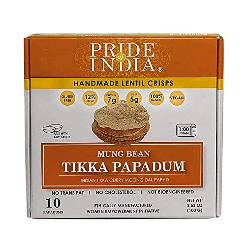 - ETHICAL SNACK: Pride of India papadum lentil crisps are handmade and ethically manufactured. Each purchase of our lentil crisps supports our women empowerment initiative and small scale industries in India. Get 10 lentil crisps in this package of Tikka Curry Masala papadums.