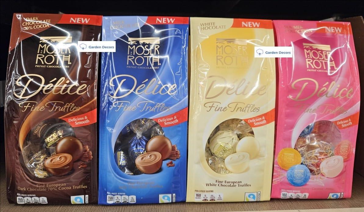 Generic Private Chocolatiers Moser-Roth Delice Fine Truffles Dark Chocolate 70% Cocoa, Milk Chocolate, White Chocolate, Summer Collection 4.9oz 140g (Four Bags), Full Size