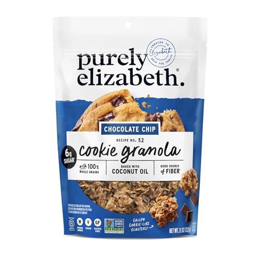 Delicious cookie meets wholesome granola in this one of a kind recipe made with 100% whole grains and 6g of sugar. Purely Elizabeth Chocolate Chip Cookie Granola is made with organic oats, whole grain oat flour, and coconut flour. Our cookie granola recipe has dark chocolate chunks, creamy almond butter, and coconut sugar for a snackable granola cluster that has the flavor and crispy texture of a delicious cookie. Enjoy Purely Elizabeth cookie granola with milk, yogurt, or on its own as a snack.