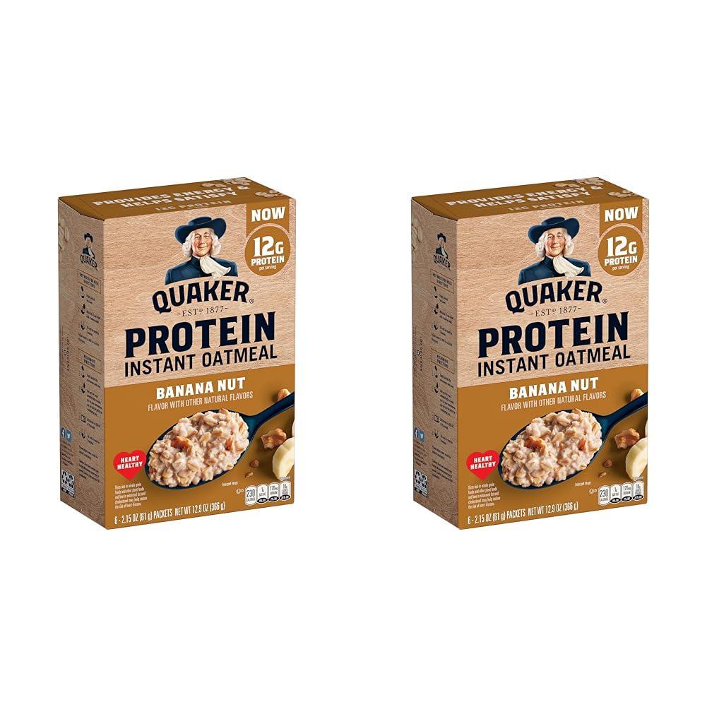 Quaker Protein Banana Nut Instant Oatmeal cooks in a microwave in less than two minutes, so you can easily start your day with the sweet flavor of bananas combined with crunchy walnuts. This wholesome breakfast option has 10 grams of protein and 40 grams of whole grains per 61-gram serving to help keep you full. Individual packets make the oatmeal easy to prepare. Just add water or milk and heat.
