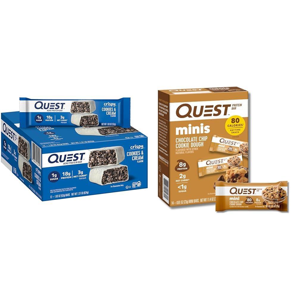 This protein bar bundle from Quest includes their popular Cookies & Cream Hero bars and Mini Chocolate Chip Cookie Dough bars. The Hero bars contain 18g of protein and only 1g of sugar each, providing a sweet treat with 3g of net carbs and 6g of fiber. The Mini bars offer 8g of protein and 1g or less of sugar per bar in a convenient on-the-go size, with 4-5g of fiber each. Both products use complete, dairy-based proteins to deliver essential amino acids. Due to supply chain issues, Quest has recently reformulated these items to include soy lecithin and soybean oil, but the change does not impact quality, flavor or texture. This tasty bundle combines Quest's signature high protein, low sugar bars in sweet Cookies & Cream and Chocolate Chip Cookie Dough flavors. The larger Hero bars satisfy bigger cravings at home while the grab-and-go Mini versions provide athlete-worthy nutrition for busy days on the move. Together they deliver protein-packed, indulgent tasting snacks with 1g or less of sugar per serving.