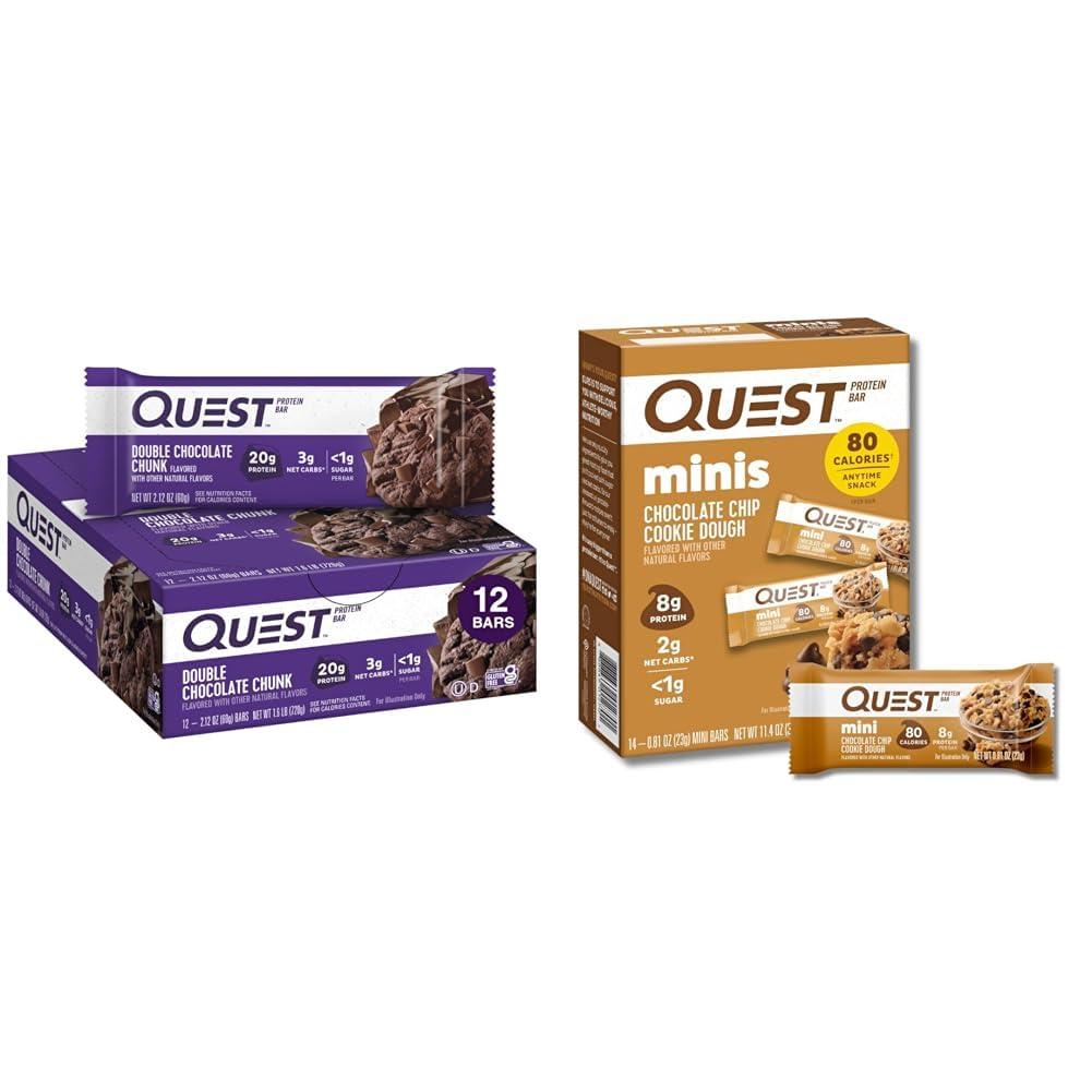 This protein bar bundle from Quest includes 12 Double Chocolate Chunk bars and 14 Mini Chocolate Chip Cookie Dough bars. Both bar varieties contain high-quality dairy proteins to provide complete proteins and essential amino acids. The Double Chocolate Chunk bars offer indulgent chocolate flavor with 20g protein, 14g fiber, 4g net carbs, and less than 1g sugar per bar. The Mini Chocolate Chip Cookie Dough bars provide 8g protein and 4-5g fiber per serving in a smaller, chewier format with the taste of cookie dough but only 1g or less sugar. Despite recent formula changes for supply chain reasons, Quest states the bars' quality, texture and flavor will remain unaffected. With their portability, lower sugar and higher protein than traditional bars, these complementary Quest offerings can support energy, muscle recovery, weight goals and active lifestyles.