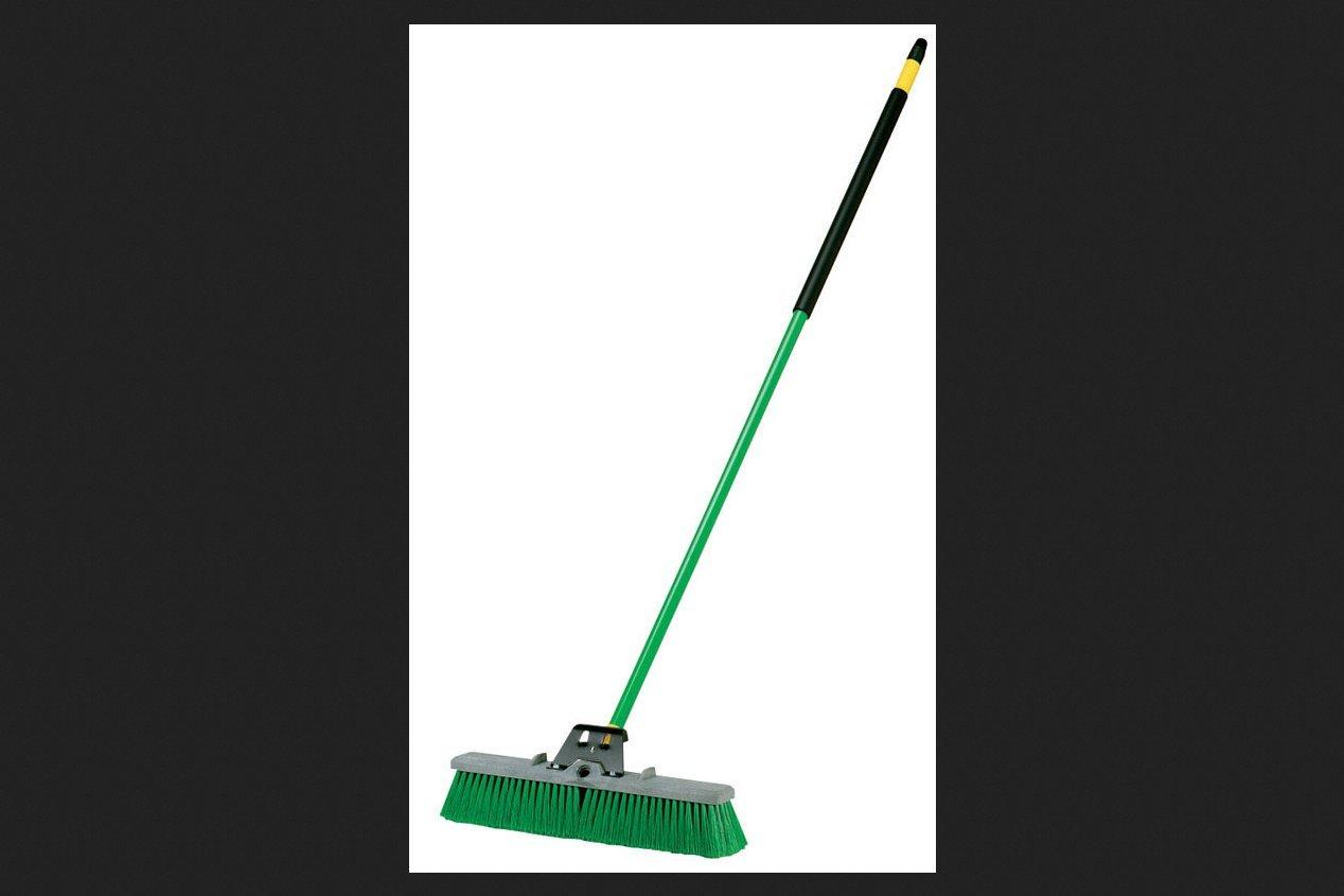 Quickie Bulldozer 18 in. Multi-Surface Push Broom is made with heavy duty, specialized material designed for indoor and outdoor do-it-yourself projects. This multi-surface push broom is specifically designed with soft outer fibers and stiff inner fibers to sweep up a wide range of debris. Ideal for use in garages, basements and sidewalks for sand, mulch, grass clippings and drywall debris. The broom head is set into a heavy duty, diamond plate designed resin block that won't warp, rot or crack with normal use. This broom comes with a built-in scraper, perfect for removing dried on or caked on debris, plus our patented tight grip holder that prevents loose handles and improves durability. This broom comes complete with clips attached to the block that can be used to store the broom unassembled. ; ; Brand Name: Quickie Sub Brand: Bulldozer Bristle Material: Polypropylene Head Width: 18 in. Product Type: Multi-Surface Push Broom Handle: 60 in. Commercial or Residential: Commercial & Residential Handle Material: Steel Bristle Length: 3 in. Color: Multicolor Handle Diameter: 15/16 in.