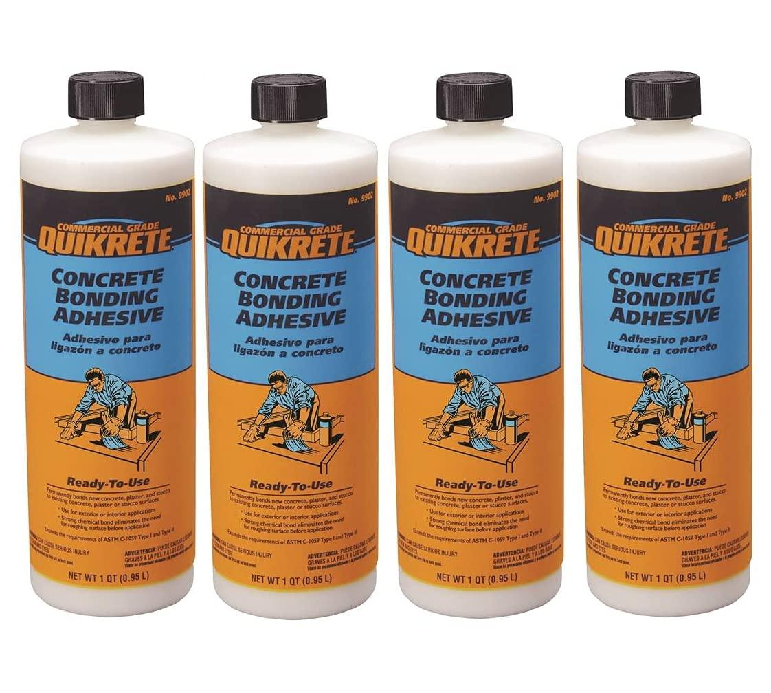 Quikrete 1 quart. Concrete bonding adhesive permanently bonds existing concrete, plaster and stucco to new concrete, plaster and stucco. Can be used indoors and outdoors on 1 inch concrete overlays. or thicker. Quikrete 1 Qt. Concrete bonding adhesive has very strong adhesive characteristics that eliminate the need to harden the surface of the existing substrate before applying a new material. 4-pack may vary