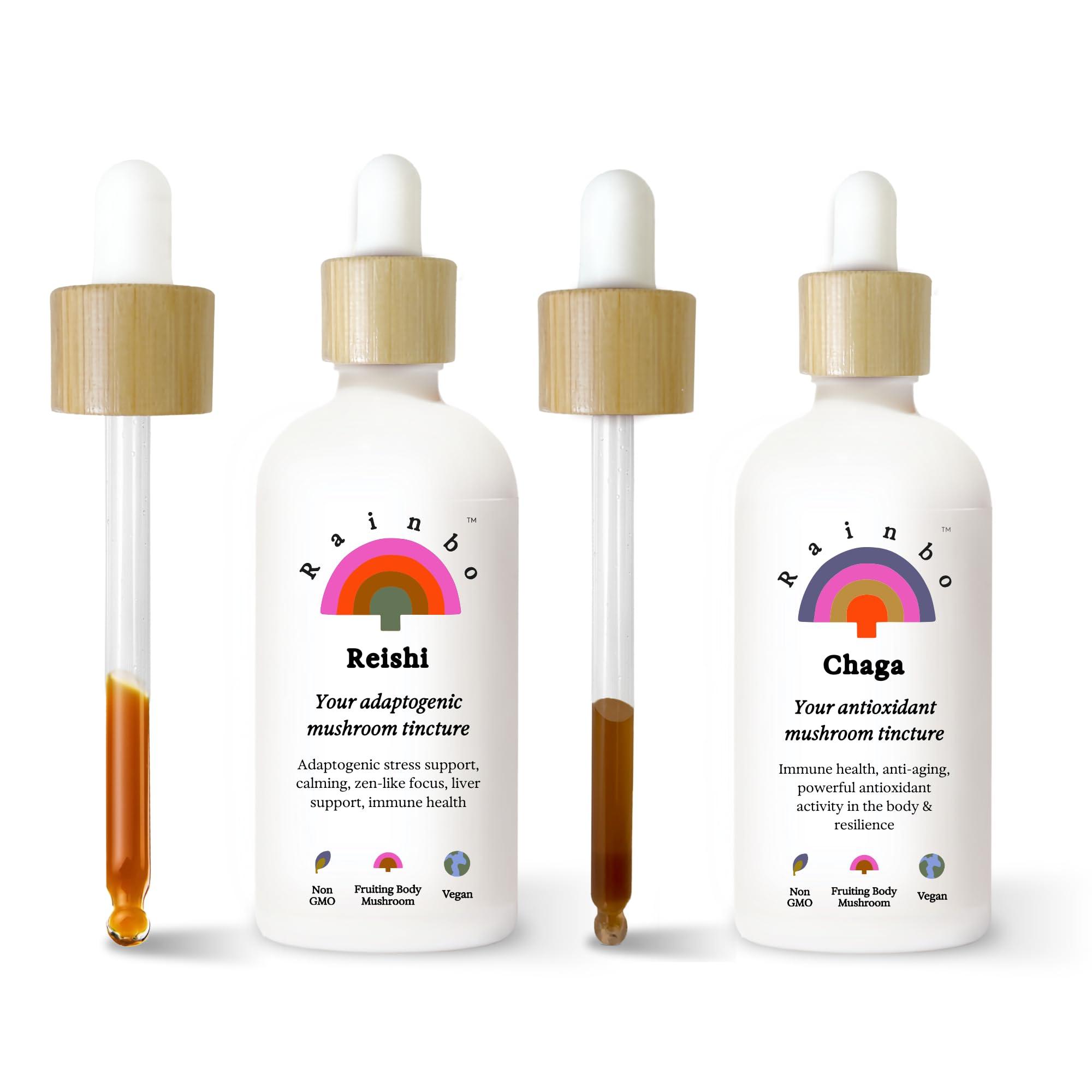 Experience the combined benefits of Reishi & Chaga mushrooms with this potent tincture bundle, designed to help support overall wellbeing. Made to be taken every day, these tinctures can assist with immune support, brain function, and more. At Rainbo, we offer potent and high quality adaptogenic mushrooms to bring radical health and harmony to people and the planet. All of our products combine potent, earth-safe ingredients with responsibly-cultivated mushrooms to bring you the best that nature and science have to offer. Rainbo daily supplements are potent and bioavailable dual extract, producing the highest quality mushroom supplement. Rainbo is a Certified B Corporation, Climate Neutral Certified, and proudly Canadian Made. We believe mushrooms work better together, so we recommend personalizing your tinctures to your needs. Explore our entire line of mushroom supplements, including lion's mane, turkey tail, reishi, chaga, cordyceps, and our alcohol free offerings.