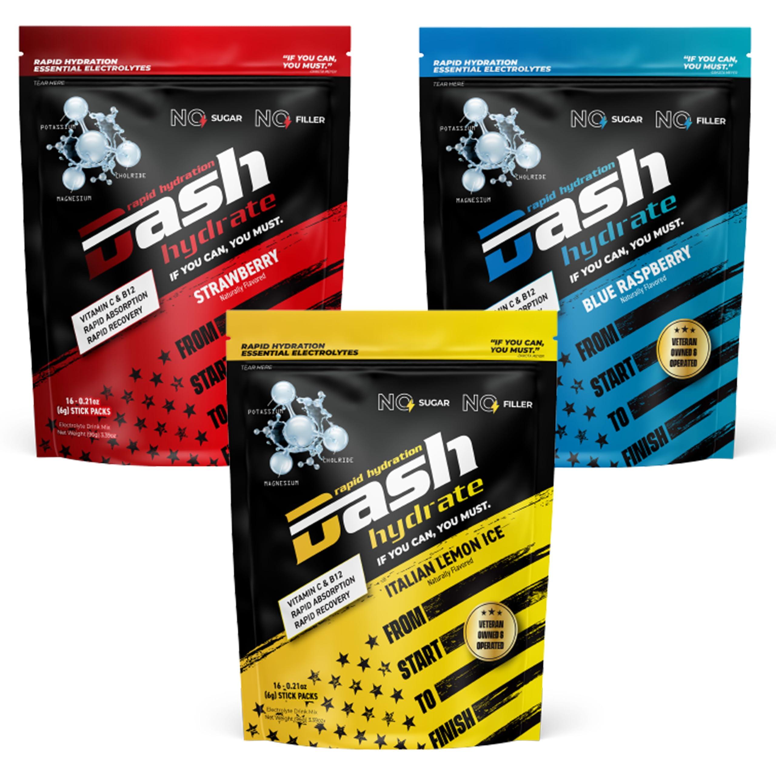 - You will receive a variety pack of (48) Dash Hydrate Rapid Hydration Electrolyte Drink Mix Packets (16-Italian Ice, 16-Straw and 16-Blue Rasp)