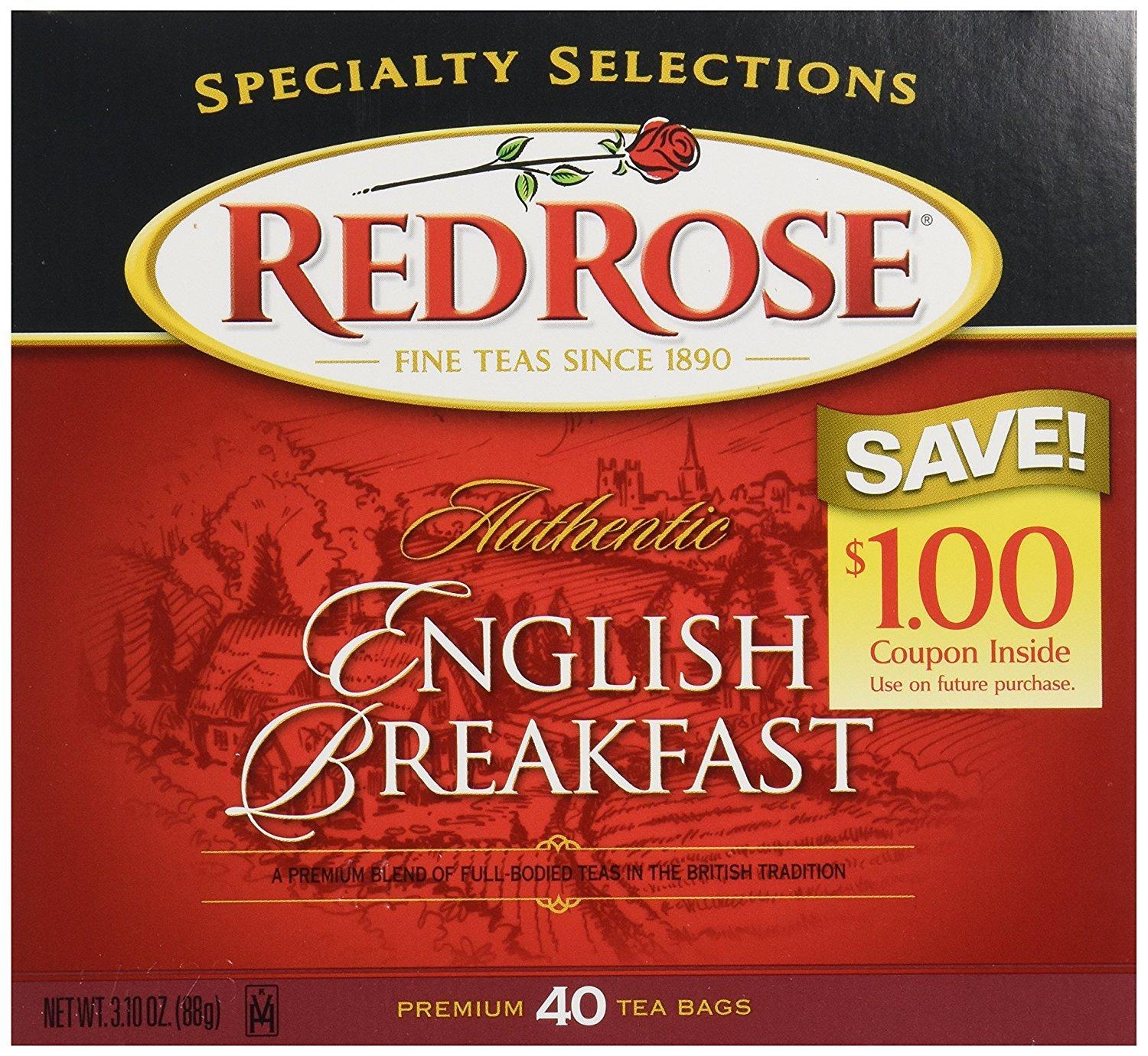 English breakfast full flavored black tea in the English Tradition. A gluten-free food. Specially blended. Fine teas since 1890. Taste the love in every cup Red Rose is blended with care to create a perfectly balanced, great-tasting tea. For more than 100 years, we have been passionate about what we do, and from that passion we've blended a naturally decaffeinated tea that preserves the full flavor of English Breakfast Tea. We have crafted this invigorating blend to provide you a robust tea to accompany a hearty breakfast in the classic English custom. We are committed to sharing our love for tea with you. So when you sit down with a cup of Red Rose Tea, savor the aroma and taste the love in every cup. Love in every cup. www.redrose.com. Follow us on facebook, twitter, instagram. Please visit us at: www.redrosetea.com. Consumer Relations: (877) 248-2477. Packaged in USA.