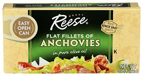 Reese's flat fillets anchovies are wild-caught and packed in pure olive oil for a high-quality appetizer or topping. Each 2 ounce can of anchovies contains no trans fat and only 25 calories per serving for a healthy snack. A product of spain, our kosher anchovies bring a tangy and exotic flair to your favorite sauces, dressings, salads, pizza or seafood.