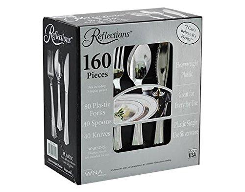 Enjoy effortless party planning with the convenience of Reflections disposable flatware The remarkable sterling silver finish provides the sophisticated look of a formal place setting 160-pc set includes 40 Forks, Spoons and Knives + BONUS 40 Forks Heavyweight plastic flatware great for everyday use. Note: plates shown are not included. Not dishwasher safe.