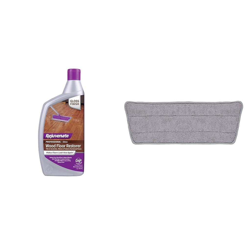 Revitalize your hardwood floors with this wood floor care bundle from Rejuvenate. The first component is a 32oz bottle of Rejuvenate Professional Wood Floor Restorer and Polish. Specially formulated to restore and protect polyurethane-finished wood floors, this mop-on formula fills scratches, eliminates the need for sanding, and leaves floors with a durable, glossy finish that resists stains and spills. Pour the restorer directly on the floor in an "S" pattern then use the included Rejuvenate Microfiber Restorer Pad to evenly mop it on. The reusable, lint-free pad ensures flawless application across up to 525 square feet. After drying, you'll have a refreshed wood floor with long-lasting protection. Together, these components provide everything you need to revitalize worn hardwood floors in your home without the cost of refinishing. The mop-on wood restorer resurfaces scratches for a smooth, glossy finish while the microfiber pad enables easy, even application. Your floors will look great for years thanks to this bundle's scratch-filling and stain-resistant wood floor restoration formula.