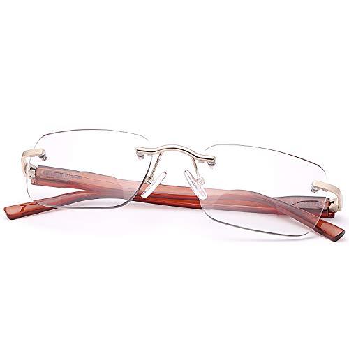 - Multifunctional Rimless Bifocal Reading Glasses Bifocal lens with blue light blocking and photochromic function,These lenses accommodate for both near and far vision by adding a unique lower lens with add vision value for reading and near vision, while blocks 100% of harmful blue light. Photochromic lenses shift from reading glasses indoor to reading sunglasses outdoor, also you can use it as normal photochromic sunglasses,Radiation protection, UV protection.
