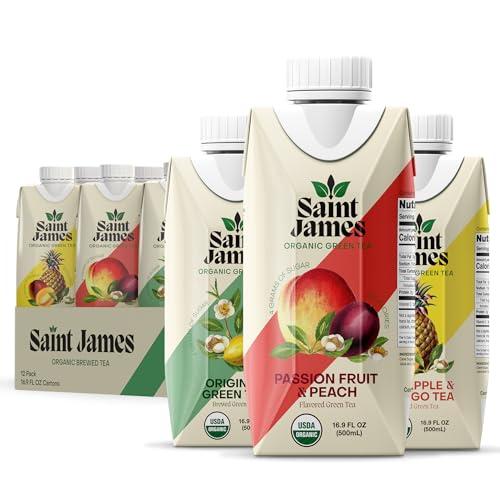 - ORGANIC & CLEAN ENERGY GREEN TEA VARIETY PACK - Saint James Iced Tea is made with all organic ingredients, providing clean energy that you can enjoy worry-free. Enjoy 4 bottles each of Passionfruit & Peach, Original Green, and Pineapple & Mango low sugar green tea!