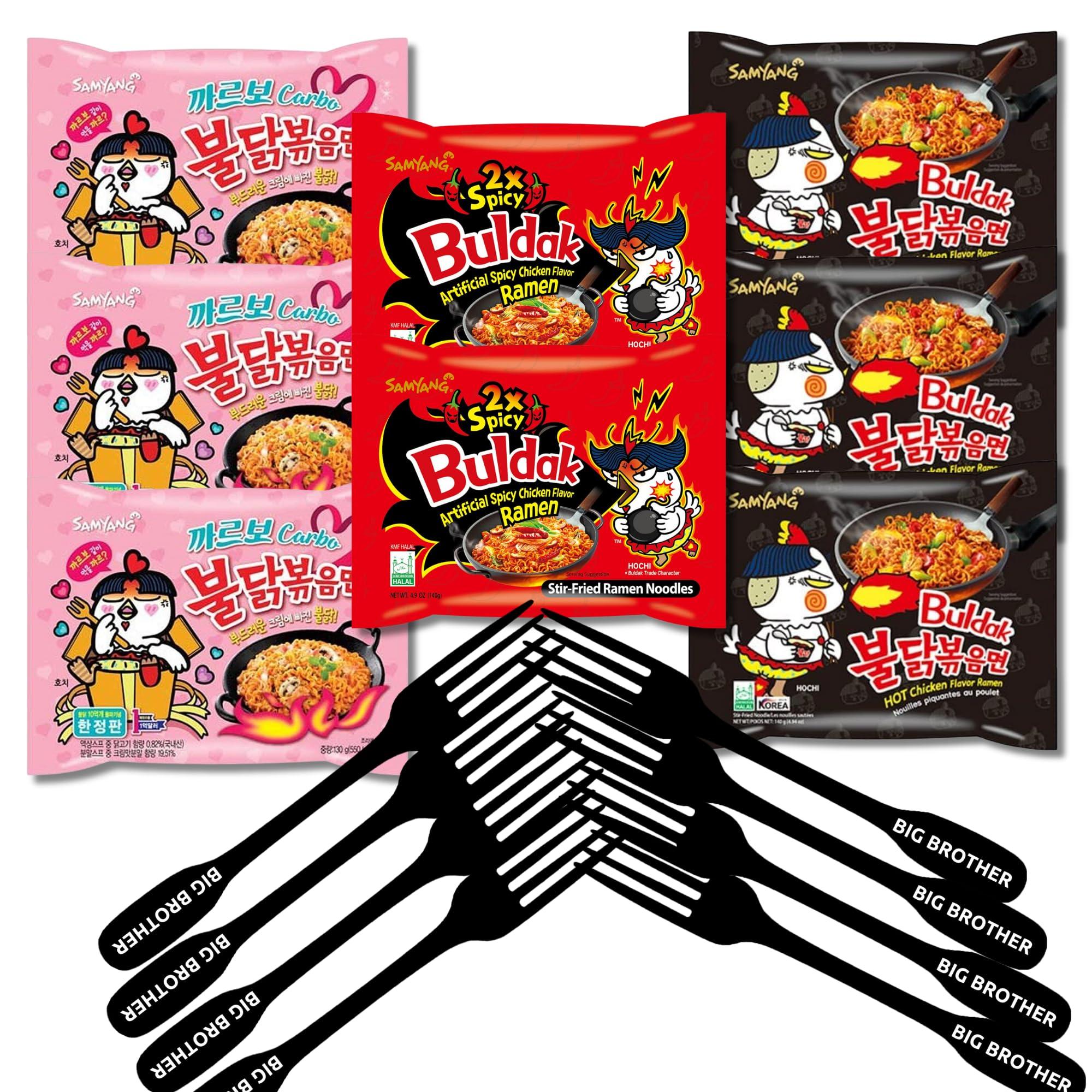 Samyang Buldak Chicken Flavor Ramen Variety Bundle : Included 3x Spicy Chicken Original | 3x Carbonara | 2x Buldak 2X SPICY | Great For The Fire Noodle Challenge | and College Students | Busy Folks | KPOP Fan with Complimentary 8x Plastic Fork ( Sing