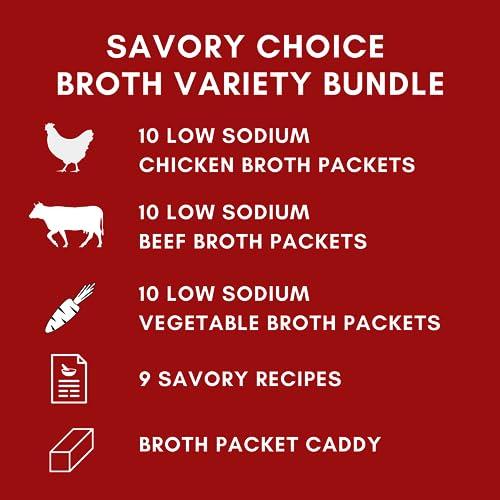- VARIETY AT YOUR FINGERTIPS: Our Reduced Sodium Broth Concentrates Variety Pack allows you to explore a world of flavors, offering Beef, Chicken, and Vegetable broth concentrates (10 each) plus a handy caddy and nine recipes. Get creative and add depth to your dishes with these versatile broths.