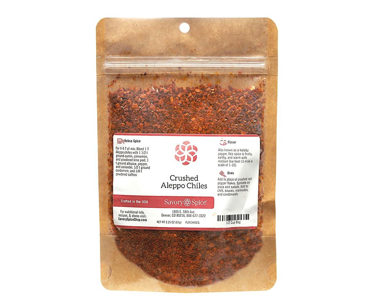 The Aleppo pepper, also known as a Halaby pepper, is named after the city in northern Syria famous for its chiles. Grown in the Middle East, these chiles are sun-dried, deseeded, and crushed. These burgundy colored peppers have a fruity, yet earthy, warm flavor that is a cross between cumin and cayenne.