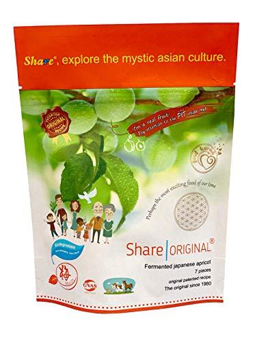A LIVING FERMENTED FRUIT FOR YOUR LIVING BODY. Content: 1 bag with seven pieces. The Share plum is one of the most exciting foods of our time. The green plum has been valued in Tradition Asian Culture since the 5th century. The plum grows in the regions of Guangdong and Taiwan, in an area the size of France. Carefully handpicked by peasant farmers, the plum is then fermented for 30 months before being coated in herbs in a scientific sound manufacturing process. The enzymes and microorganisms released as a result of the fermentation are particularly valuable for the human body. The formula of Share-Original is protected worldwide and therefore unique.