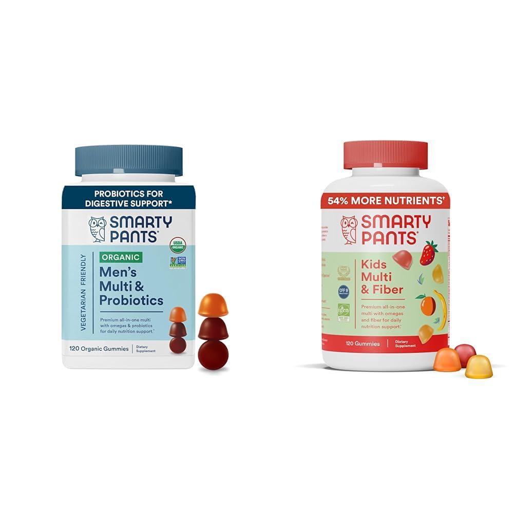 This bundle combines a premium multivitamin formulated for men with a kids' multivitamin that includes prebiotic fiber. The SmartyPants Organics Men's Complete provides a science-backed blend of 14 essential nutrients to support men's health. It delivers 120 organic gummies with vitamins, vegetarian omega-3s, probiotics, and key minerals like zinc and selenium. The unique gummy form makes nutrients easy to absorb. The SmartyPants Kids formula packs a blend of 17 nutrients to nourish growing bodies, with 120 gummies that combine a multivitamin, fiber for digestion, and omega-3s EPA and DHA from fish oil. It utilizes high-quality, bioavailable nutrient forms for better absorption. Together, these thoughtfully formulated gummies provide a complete spectrum of daily nutrition for men, kids, and the whole family. The organic and non-GMO ingredients supply optimal nutrient sources to complement active, healthy lifestyles across generations.
