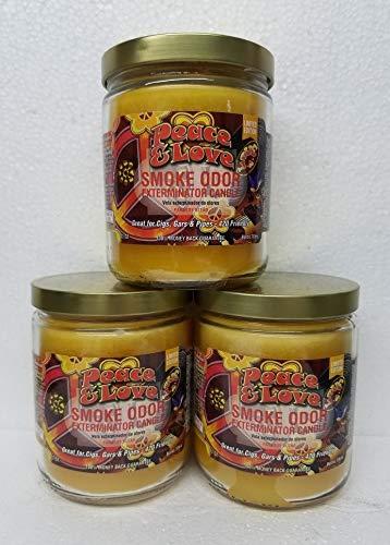 Smoke Odor Exterminator 13oz Jar Candle, Peace & Love Three Pack. Each candle burns approximately 70 hours Candles made in the USA. These are great at eliminating strong odors. And they also work well for any odors -- like Food or pet odors.