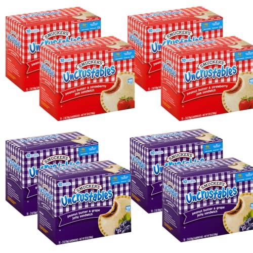 Just thaw, unwrap, and snack wherever you are! Uncrustables Peanut Butter & Grape jelly Sandwiches and peanut butter & strawberry jam sandwiches are a convenient, packable snack to take along wherever you and your kids are going next. This 10-count snack food pack comes with 10 single serve sandwiches that are individually wrapped for anytime snacking. With 6 grams of protein (5% DV) per serving, these frozen grab-and-go sandwiches taste great and are full of peanut butter and grape jelly flavor.