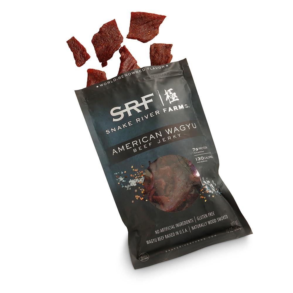 Snake River Farms American Wagyu beef jerky is handcrafted with our world-class beef and natural ingredients. Rich American Wagyu beef is perfectly seasoned with tamari, pepper, garlic, onion and sea salt and lightly sweetened with cane sugar for an exceptional taste experience that is gluten-free with no nitrates. This is our latest version of this ideal on-the-go snack which features a softer bite, a more flavorful formulation and larger size. Our jerky is 100% natural and packs 7 grams of protein into each one ounce serving. Made using whole-muscle American Wagyu cuts to our exacting standards, Snake River Farms beef jerky checks all the boxes for flavor, convenience, and nutrition. Packaged in a new 10 oz. resealable pouch. | Wagyu Beef Jerky 10 oz., Snake River Farms
