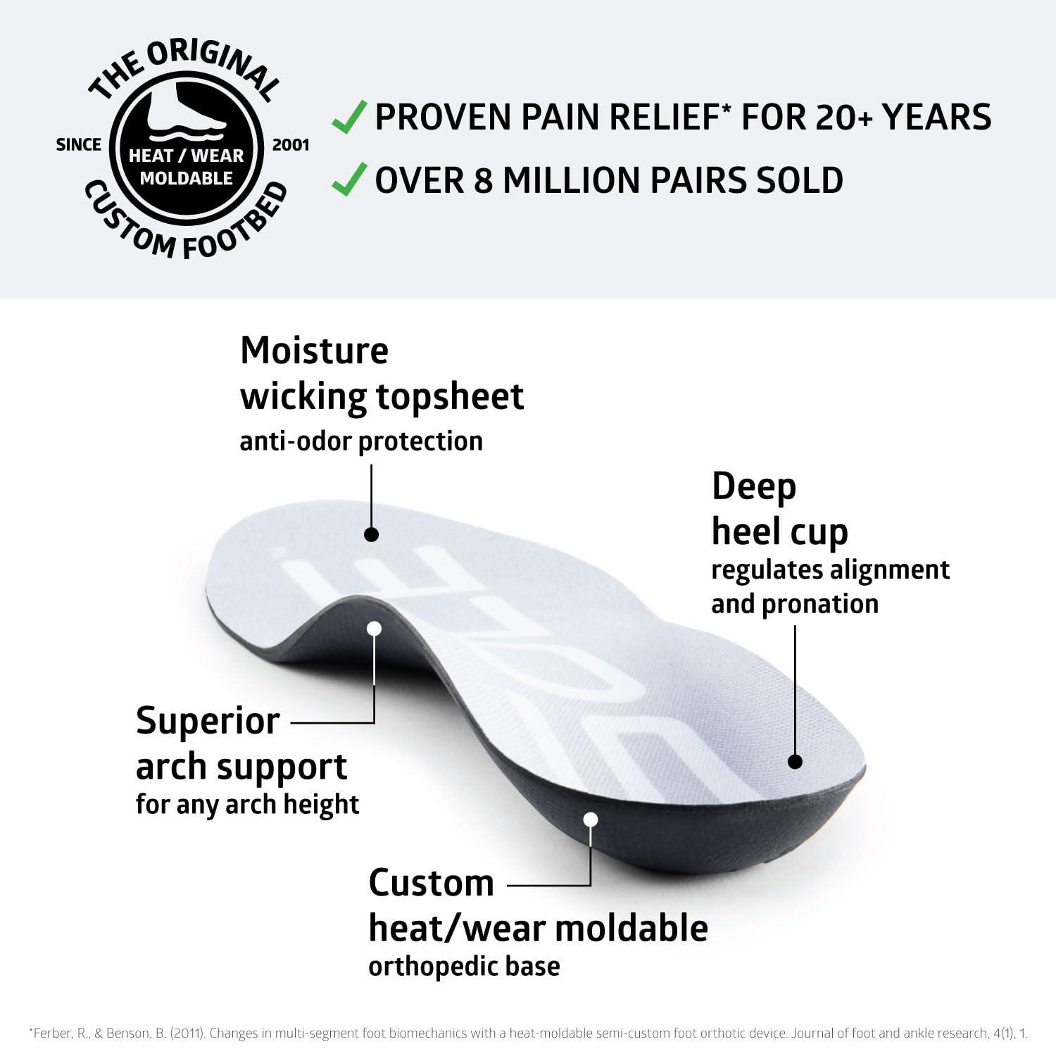 - CUSTOM SUPPORT SUITABLE FOR ANY ARCH HEIGHT - custom heat moldable meaning you can get custom support for your unique feet - we recommend people with low arches and flat feet heat mold their insoles in the oven at home following simple heat molding instructions for best results - people with high arches will enjoy the support straight out of the box.