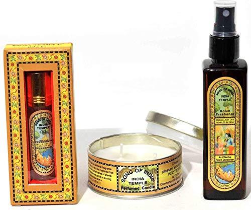 Song of India - India Temple Gift Set #5: (1) 8 ml. Scented Body Oil, (1) 55 gm. Two Wick Perfume Candle and (1) 100 ml. Room Freshener. Imported from India. The original, light, fresh scent of holy temples in India. Aroma is designed to smell just like a temple in India. Using only the finest herbs, spices, fragrant wood powders, essential perfume oils and resins to create this heavenly fragrance. A very fine fragrance that matches and blends into the human sense of scents.