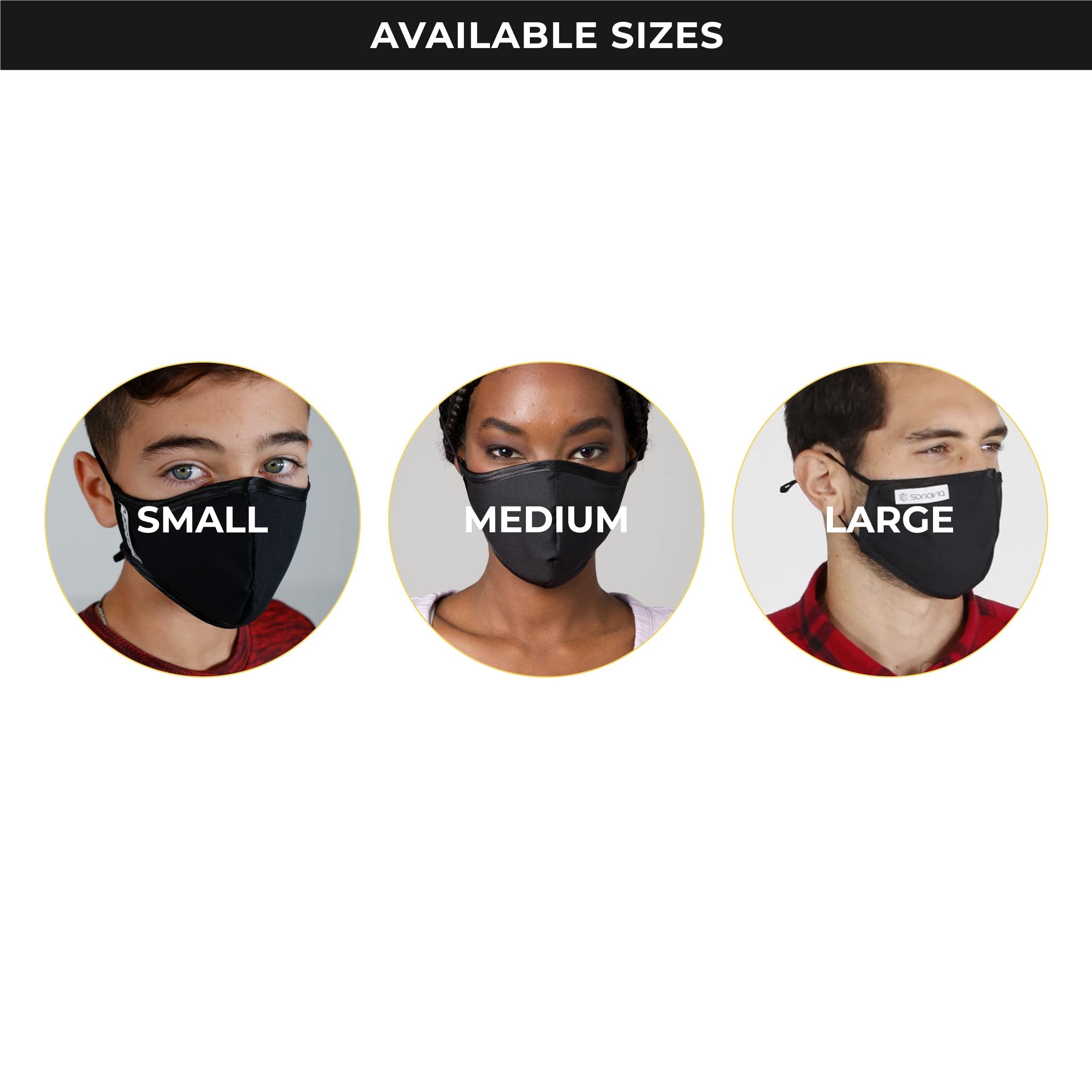 - EXCELLENT FIT & FULLY ADJUSTABLE: The SonoMask is a multi-layer mask made from a novel fabric developed and perfected for over a decade. A flexible nose wire provides a leak-proof seal from all sides of the mask assuring maximum protection and no fogged-up glasses. Adjustable sliders on your choice of ear straps ensure a custom fit for all face shapes and sizes.