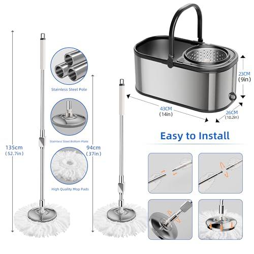 - Spin Mop and Bucket Benefit: Spin mop and bucket made of high quality stainless steel, stronger spin wringing performance than those work with pedal, so the mop head wrings drier, save efforts and is more durable. You don't have to spend as much energy to get the mop head to spin.