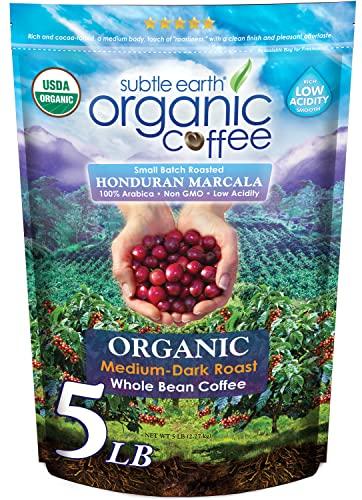 Subtle Earth Organic Coffee - Medium Dark Roast - Whole Bean Coffee - 100% Arabica Beans - Low Acidity and Non-GMO - 5lb bag