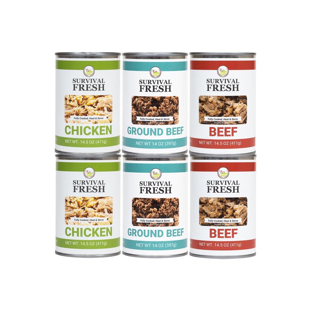 - TASTY & DELICIOUS: We acknowledge "Canned Meat" sounds weird, but just one bite and you'll be adding as many cans as possible to your long-term food supply. Preppers, campers and meat-lovers have rated this the "best survival food" available. We agree. Package includes six 14.5oz Cans: 2 Beef, 2 Chicken, and 2 Ground Beef Hamburger.