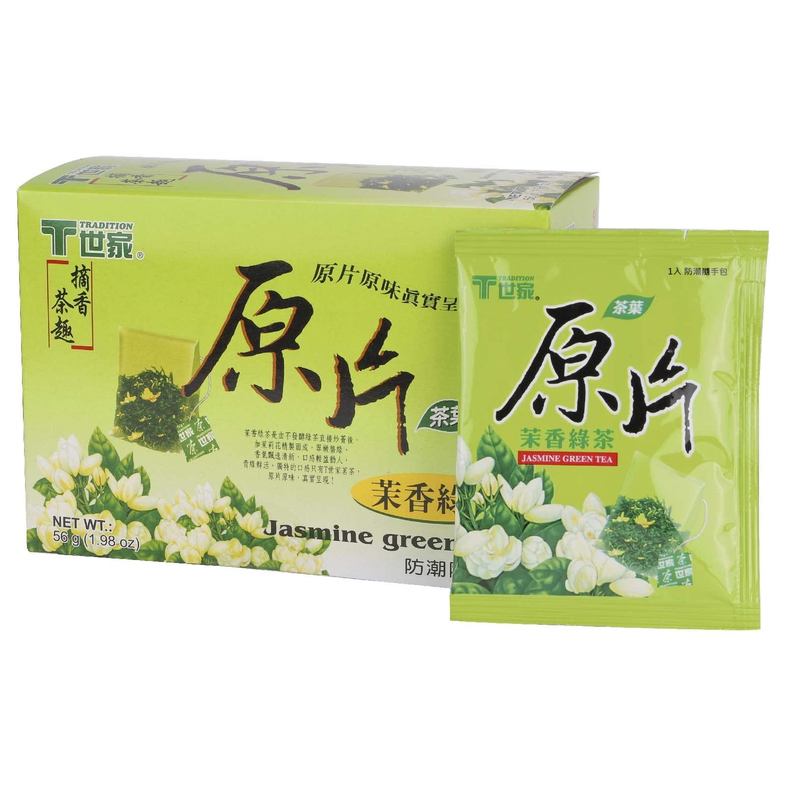 T TRADITION Jasmine Green Tea in 1.97oz (56g) box. Contains 20 individually foil wrapped bag/ box. Using the fresh unfermented gree tea, scented with jasmine blossom. The unique flavor and delicate jasmine aroma will promote a relaxed and pleasant mood.