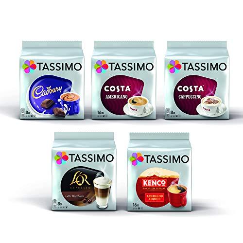 Tassimo Coffee Selection - Costa Cappuccino/Americano/Cadbury Hot Chocolate/L'Or Latte Macchiato/Kenco Americano pods - 5 Packs (56 Servings)